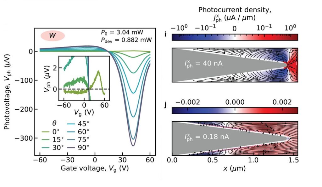 «Ключевым элементом в наших устройствах является клиновидное металлическое заострение поверх двумерного материала, — объясняет один из авторов работы, научный сотрудник лаборатории оптоэлектроники двумерных материалов Центра фотоники и двумерных материалов МФТИ, научный сотрудник АО «Сканда Рус» Кирилл Капралов. — При освещении заострение многократно усиливает интенсивность излучения вблизи вершины. Далее происходит конвертация излучения в нагрев электронов в малой чувствительной области около вершины клина. А затем горячие электроны движутся в сторону противоположного холодного контакта и собираются им. То есть клин сначала как бы «фокусирует» излучение в нужной области устройства, а после этого задаёт носителям преимущественное направление движения, создавая тем самым фототок».
