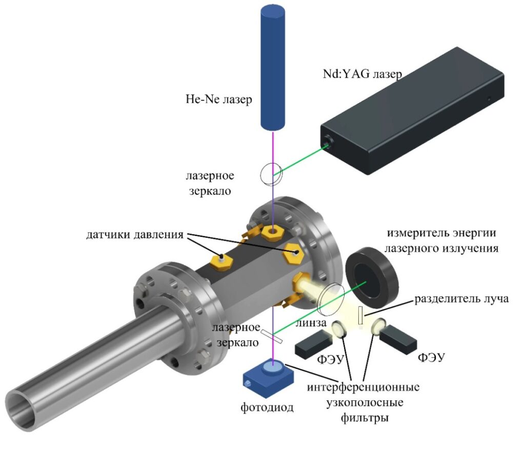 Рисунок 1. Экспериментальная установка, состоящая из ударной трубы и оптических приборов, которые используют при реализации методов: лазерной экстинкции (голубой цвет) и лазерно-индуцированной инкандесценции (темно-серый цвет). Источник: журнал «Кинетика и катализ».