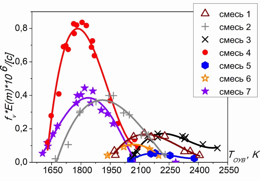Применение метода лазерной экстинкции на длине волны 633 нм показало диапазоны температур, которые соответствуют максимуму объемной доли сажи, образующейся при пиролизе разных углеводородов (Рисунок 2). Наибольшее количество сажи получено из бензола, примерно вполовину меньше — из ацетилена и фурана. Вместе с тем, бензол, тетрагидрофуран и диэтиловый эфир быстрее превращается в сажу, чем другие углеводороды. Из всех изученных соединений самый широкий температурный интервал сажеобразования у ацетилена. Размер частиц сажи находится в диапазоне 7─21 нм.