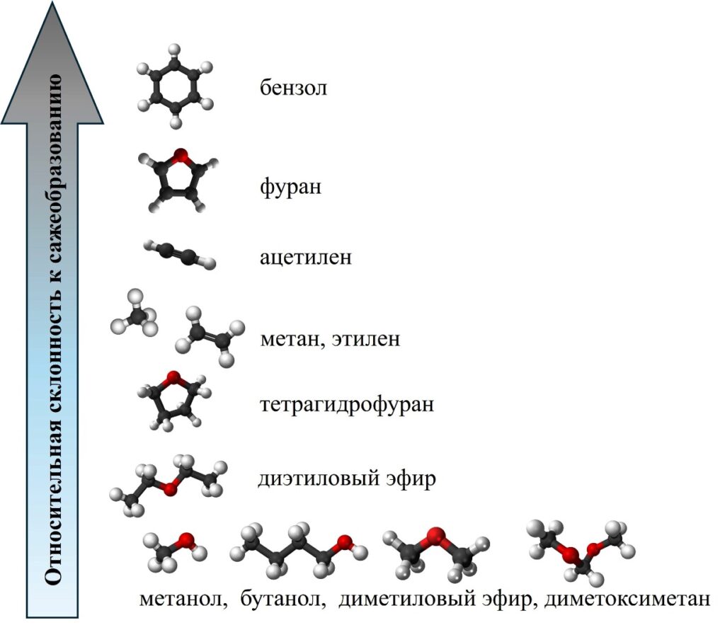 «Мы установили, что больше всего сажи образуется из веществ с циклической структурой, а минимальные количества — из спиртов и линейных эфиров, не имеющих углерод-углеродных связей C – C, — говорит Александр Еремин, заведующий лабораторией неравновесных процессов ОИВТ РАН. — На основании полученных данных мы составили схему относительной склонности к сажеобразованию исследованных углеводородов, первое место в которой занимает бензол».