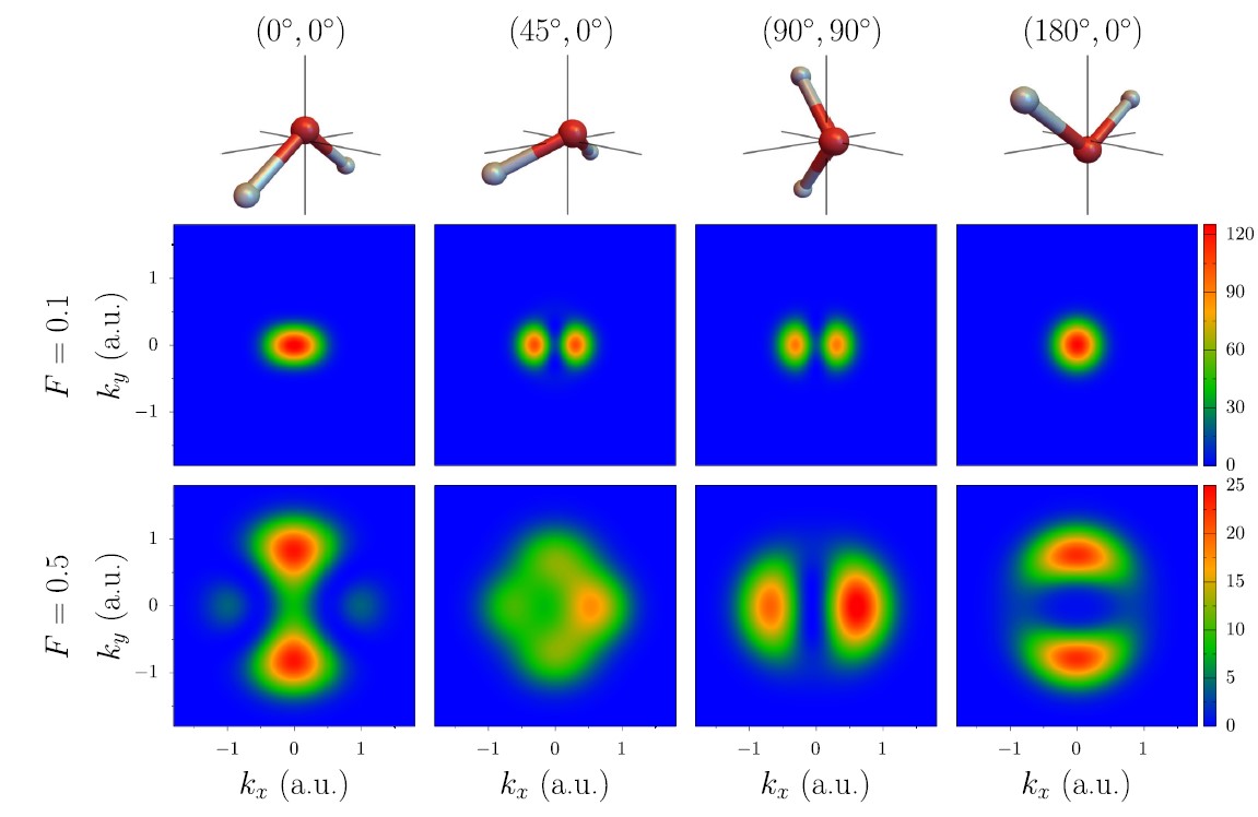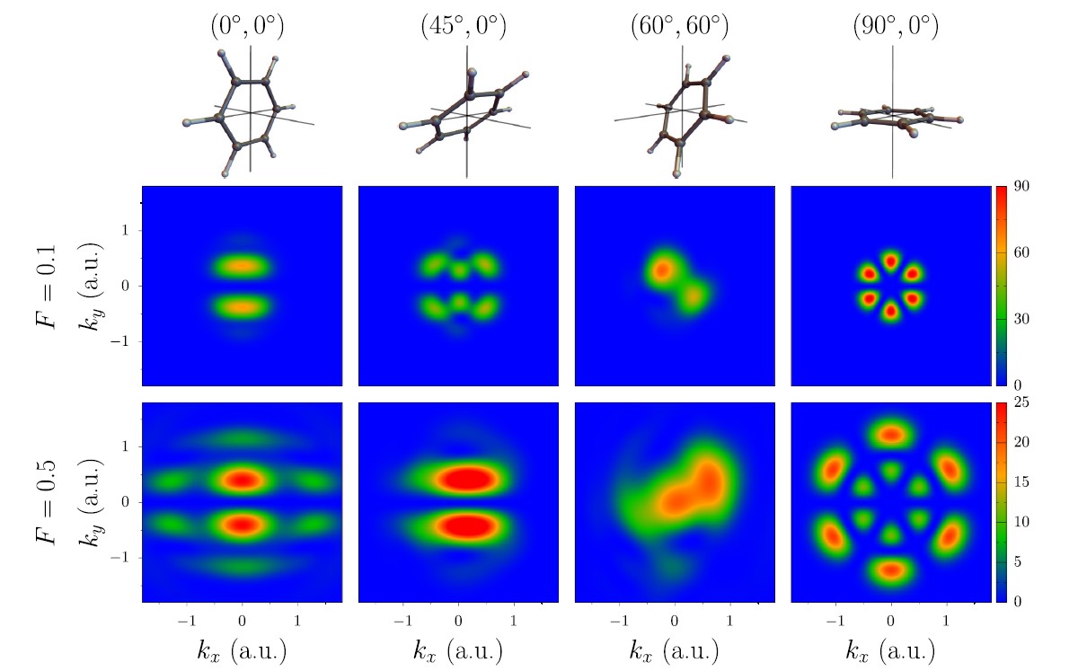 Кроме того, было обнаружено, что форма распределения по поперечным импульсам вылетевших электронов отличается от гауссовой, которая характерна для описания в приближении слабого поля. Она приобретает сложную интерференционную структуру, которая кодирует информацию о геометрии молекулы, позволяющую восстановить расположение атомов.
