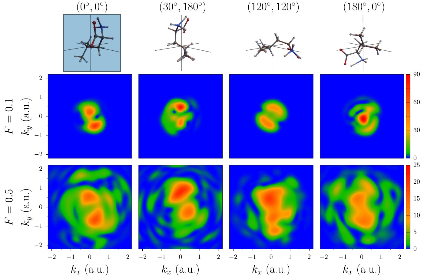 Рисунок 6. Функция поперечного импульса при четырех разных ориентациях (β, γ ) лейциновой молекулы, указанных и проиллюстрированных в верхнем ряду. Средний и нижний ряды показывают точные результаты для двух напряженностей поля. Источник Physical Review A.