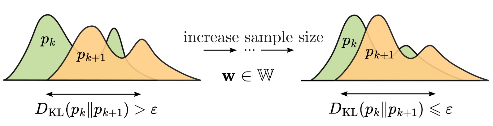 Рисунок 1. С увеличением размера выборки расстояние Кульбака-Лейблера между соседними апостериорными распределениями уменьшается. Источник: GitHub — kisnikser/Posterior-Distributions-Proximity: Official implementation of «Sample Size Determination: Posterior Distributions Proximity»