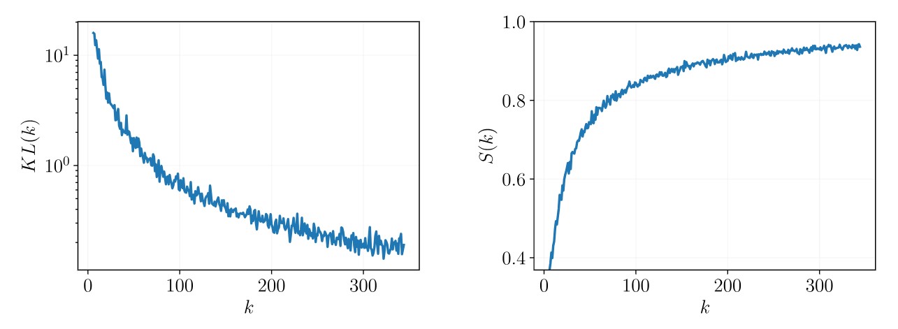 Рисунок 3. Набор данных Liver Disorders предоставляет результаты для сходимости предлагаемых функций оценки размера выборки. Слева у нас есть расхождение Кульбака–Лейблера, которое стремится к нулю по мере увеличения размера выборки. Справа у нас есть функция сходства s-score, которая стремится к единице по мере того, как размер выборки стремится к бесконечности. Источник: Computational Management Science.
