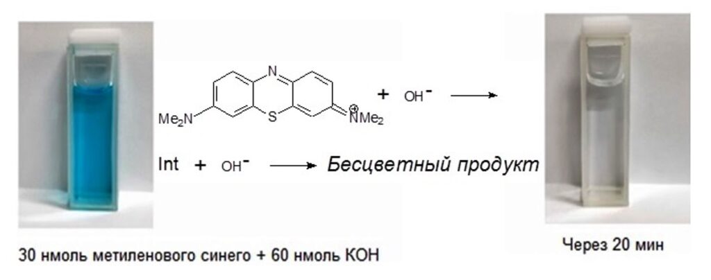 Ученые установили: если концентрация гидроксида калия в изучаемой системе мала, то метиленовый синий быстро обесцвечивается (Рисунок 1). Расход щелочи в 2 раза больше, чем красителя, что говорит о двухстадийном процессе. Константа скорости реакции составляет 0,039 ± 0,004 мкМ-1 ∙ мин-1.