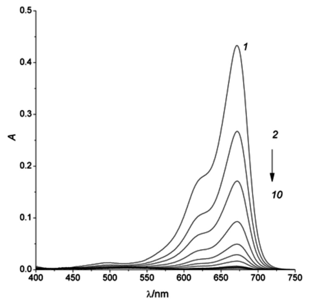 Рисунок 2. Спектр поглощения 2 мл 4,5 мкМ раствора метиленового синего (кривая 1) и его эволюция (кривые 2–10) спустя 120 мин после добавления 10 мкл 3 мМ раствора гидроксида калия. Растворитель — диметилсульфоксид. Источник: Dyes and Pigments.