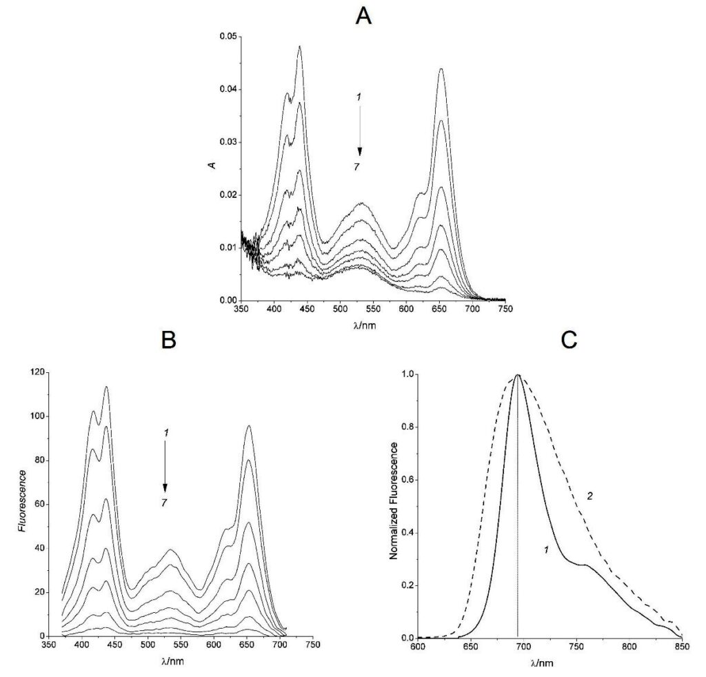 Рисунок 3. Спектры поглощения 2 мл 4,5 мкМ раствора метиленового синего в диметилсульфоксиде через 1, 3, 7, 11, 15, 22 и 30 мин (кривые 1–7) после добавления раствора гидроксида калия большой концентрации (A). Спектры возбуждения флуоресценции (кривые 1–7), зарегистрированные в тех же условиях на длине волны 730 нм (B). Нормированные спектры флуоресценции метиленового синего (сплошная линия) и нового неустойчивого продукта реакции (пунктирная линия) при длине волны возбуждения 620 нм (C). Источник: Dyes and Pigments.