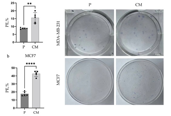 Рисунок 1. Клоногенный анализ. (a) и (b), эффективность посева (PE, %) линий клеток MDA-MB-231 и MCF7 до (P, родительская) и после (CM) миграции в ограниченном пространстве; (c) Репрезентативные изображения колоний клеток MDA-MB-231 и MCF7, окрашенных красителем Гимза. Данные представляют собой средние значения ± SEM трех независимых экспериментов. Источник: Scientific Reports.