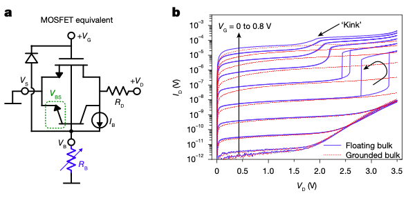 (a) Схема модифицированного «нейроMOSFET»-транзистора: Ib — зона ударной ионизации, Rb и Rd — сопротивление подложки и стока, Vs — напряжение на источнике. (b) Вольтамперные характеристики такого транзистора, красным в нормальном режиме (заземленная подложка), синим — в модифицированном