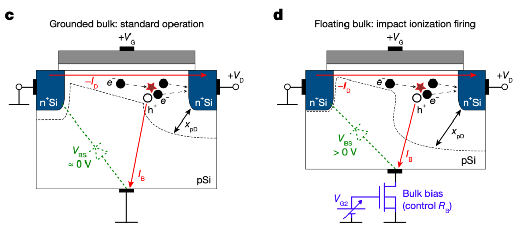Авторы настоящей статьи управляли проявлением этого эффекта с помощью второго транзистора, подключенного своим каналом последовательно к подложке первого. Так получилось подобрать такой режим, при котором транзистор самопроизвольно открывался при некотором пороговом напряжении сток-исток, реализуя тем самым механизм порогового срабатывания нейрона, за которым следовало автоматическое закрытие транзистора при несколько меньшем значении напряжения.