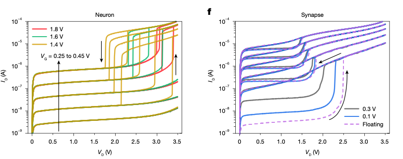 Слева: вольтамперные характеристики искусственного нейрона; справа: характеристики искусственного синапса