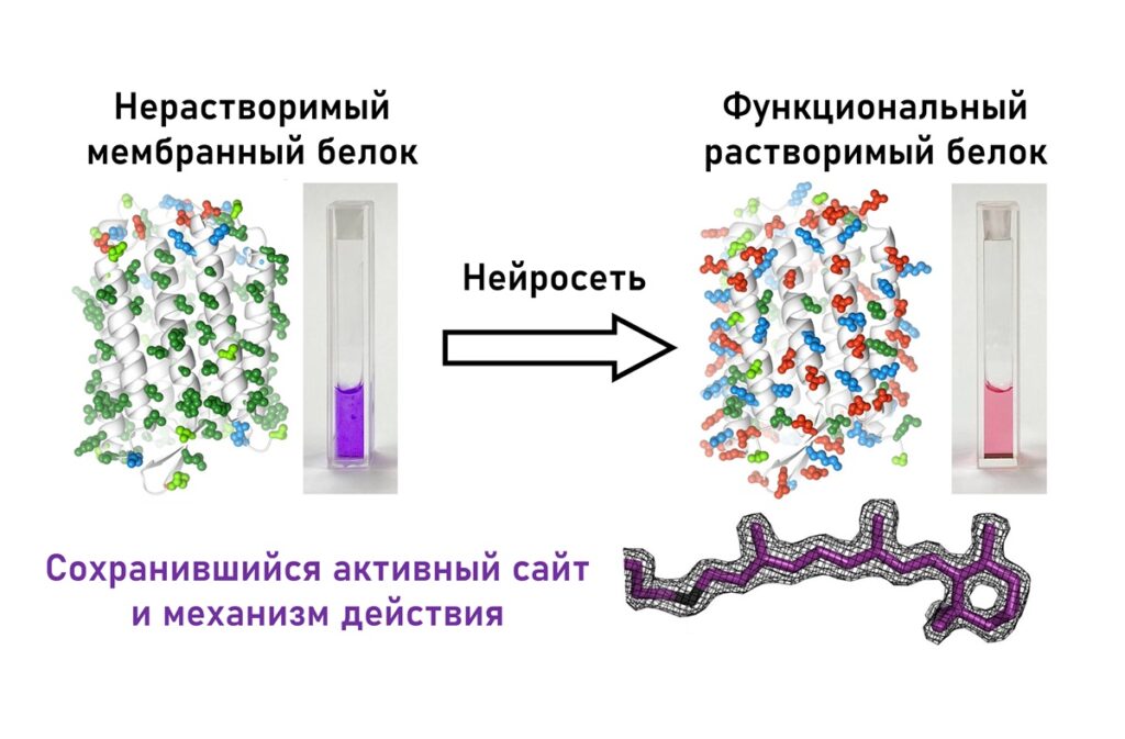 Ученые из МФТИ разработали новый подход для превращения мембранных белков в растворимые с помощью нейронных сетей. Мембранные белки отвечают за «общение» живой клетки с окружающей средой, и теперь их станет легче изучать, в том числе находить действующие на них лекарства. Результаты работы опубликованы в журнале Chemical Science (входит в Nature Index).