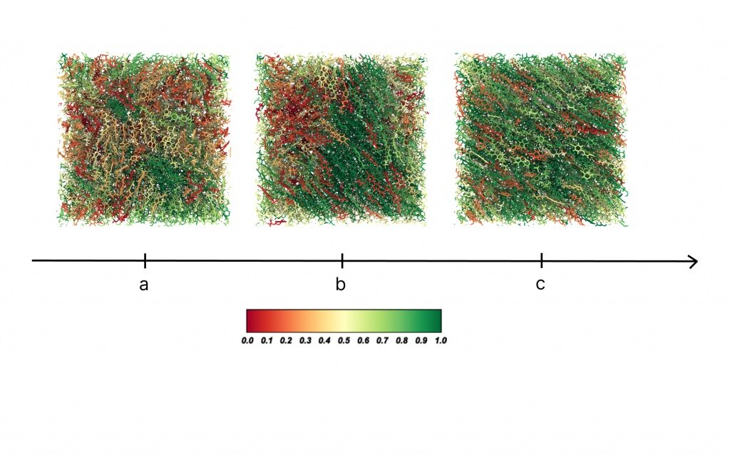 Рисунок. Переход жидкого кристалла из изотропной фазы в нематическую. а) вычислительная ячейка в исходном состоянии (изотропная фаза), b) в промежуточном состоянии, c) в конечном состоянии (нематическая фаза). Раскраска молекул производится по величине проекции главной оси молекулы на ось директора. Темно-зеленым цветом обозначены молекулы, сонаправленные с директором, а красным – молекулы, перпендикулярные директору. Источник: авторы исследования