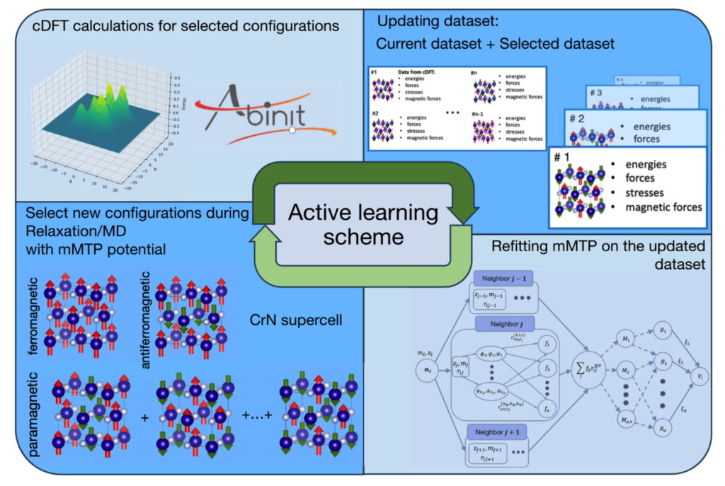 Кроме того, наличие магнитных моментов в функциональной форме потенциалов усложняет его обучение. Для решения этой задачи исследователи разработали алгоритм, который автоматически выбирает оптимальные конфигурации для обучающей выборки. Алгоритм отслеживает конфигурации, возникающие прямо в процессе моделирования с обучаемым потенциалом, и для отобранных конфигураций проводятся расчёты с помощью теории функционала плотности. Полученные данные добавляются в обучающую выборку, на основе которой происходит обучение потенциала.