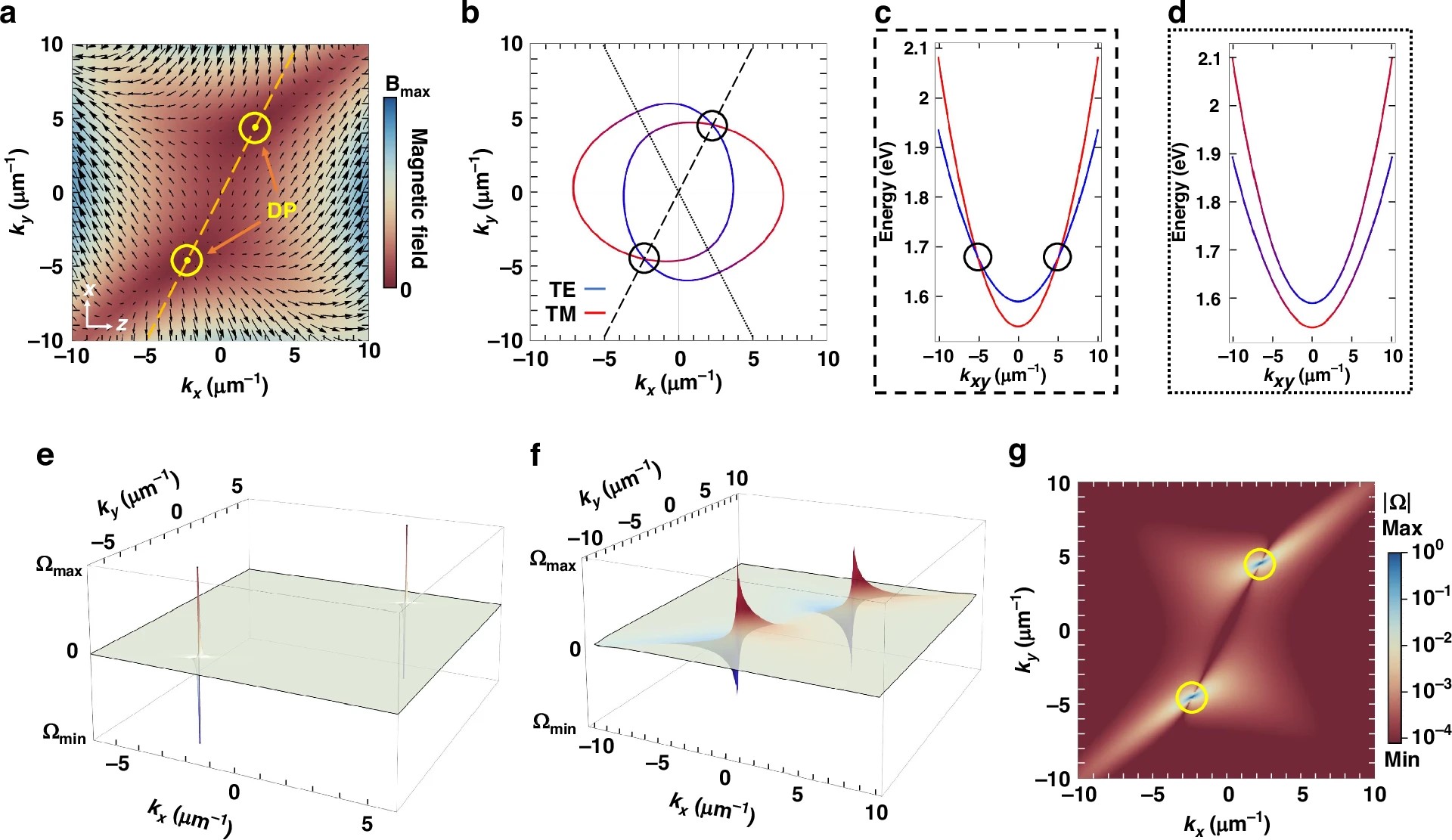 Рисунок 2. a) Карта синтетического магнитного поля. Эта карта показывает рассчитанное эффективное магнитное поле, которое «чувствует» свет в зависимости от его импульса (направления движения). Стрелки указывают направление поля, а цвет — его силу. В двух особых точках синтетическое магнитное поле полностью обнуляется. (b, c, d). Эти графики сравнивают энергетические уровни двух световых мод. На пути, который проходит точно через дьявольские точки (с), уровни просто пересекаются, не взаимодействуя друг с другом. На любом другом пути (d) уровни «отталкиваются», образуя зазор (анти-пересечение). ( e, f, g) Визуализация топологии через кривизну Берри. Кривизна Берри — это фундаментальная характеристика, описывающая «закрученность» квантовой системы. Графики (e) и (f) показывают, что именно в особых точках кривизна Берри становится бесконечной, образуя два острых пика (положительный и отрицательный). Карта (g) наглядно выделяет эти две точки с экстремальной кривизной. Наличие таких сингулярностей является неопровержимым математическим доказательством того, что в системе создано нетривиальное топологическое состояние. Источник: Light: Science & Applications