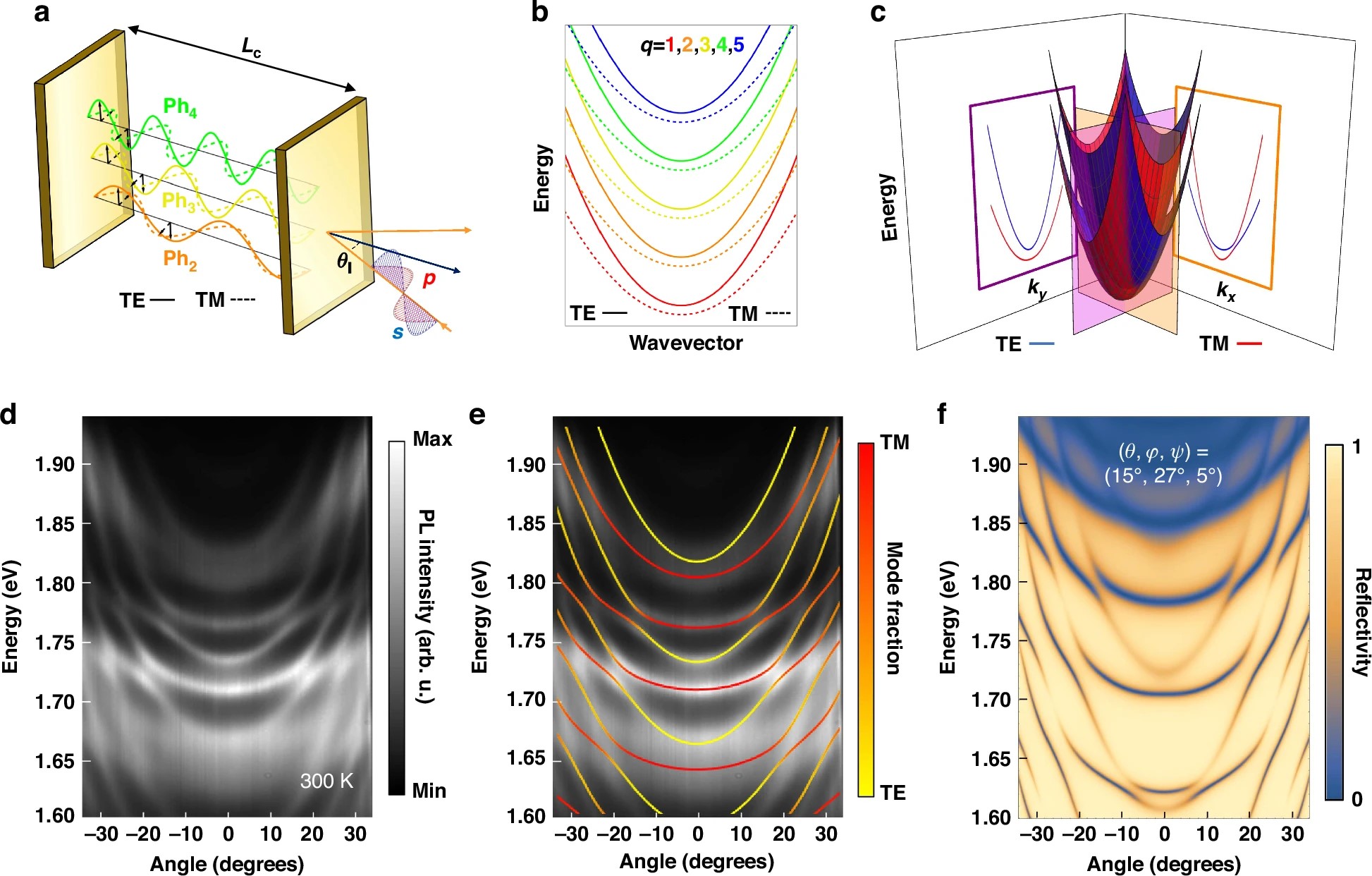 Рисунок 1. a) Принцип работы устройства b). Теоретическое предсказание: диаграмма показывает, что должно происходить со светом в резонаторе с анизотропным кристаллом. Каждая световая «нота» расщепляется на две близкие по энергии линии из-за свойств резонатора и анизотропии самого кристалла. c) Главный теоретический результат — асимметричное взаимодействие: здесь смоделировано поведение двух световых мод, которые в обычной ситуации не должны взаимодействовать. d) Экспериментальные данные, полученные с микроскопа при комнатной температуре. Яркие изогнутые линии — это свет, испускаемый системой под разными углами. На графике отчетливо видны те самые «анти-пересечения», которые были предсказаны теорией в (c). Это прямое доказательство того, что ученым удалось создать и наблюдать сильное спин-орбитальное взаимодействие для фотонов. e) Подтверждение теории: Этот график — результат компьютерного моделирования, основанного на новой теоретической формуле (эффективном Гамильтониане) исследователей. Он практически идеально совпадает с экспериментальными данными из (d), что доказывает верность их теоретической модели и правильность понимания физических процессов. f) Определение причины эффекта: более точная симуляция не только воспроизводит наблюдаемую картину, но и позволяет сделать следующий шаг: рассчитать точную трехмерную ориентацию микрокристалла перовскита, которая и привела к появлению именно такого уникального рисунка взаимодействия. Углы (15°, 27°, 5°) — это углы Эйлера, описывающие наклон и поворот кристалла в пространстве. Источник: Light: Science & Applications