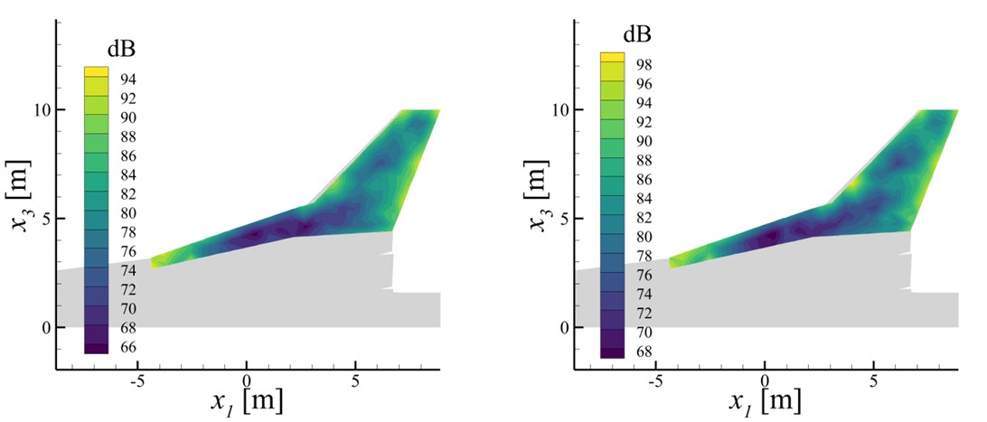 Для расчета распространения шума на большом расстоянии от прототипа самолета использовался метод Фокса Уильямса–Хокингса (FWH). Акустические данные для этого метода собирались в узлах расчетной сетки, формирующих некоторую охватывающую крыло поверхность вне зон сильной нелинейности..