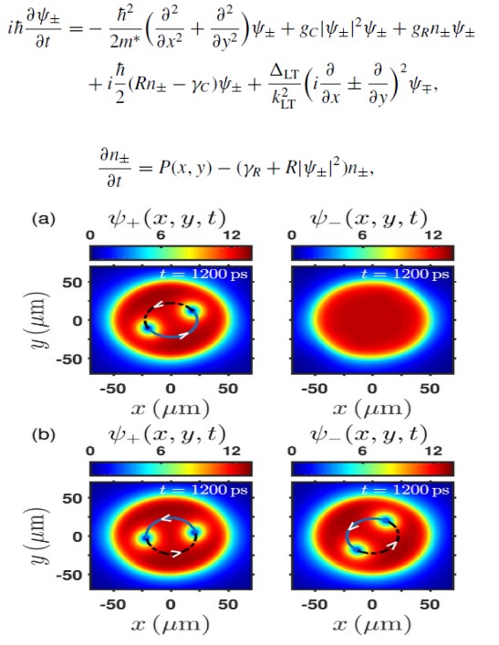 Рисунок 1. Вихревые молекулы внутри волновых функций ψ+ и ψ- поляритонного конденсата в модели Гросс-Питаевского, которая задана уравнениями на рисунке. n+ и n- обозначают плотность экситонного резервуара, индексы ± соответствуют спиновым компонентам. Траектории от 1200 пс до 2280 пс изображены синими сплошными линиями и черными пунктирными линиями, белые стрелки указывают направление движения. Параметр LT поперечно-магнитного расщепления равен 1 МэВ, импульс kLT = 5 мкм-1. Распределение вихрей в двух компонентах: (a) Два вихря в ψ+ и ни одного вихря в ψ-. (б) Два вихря в обоих ψ+ и ψ-. Источник: Physical Review B.