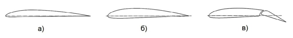 Рисунок 1. Расчетные профили крыла: а) NACA 5312, Clark Y+ с закрылком б) неотклоненным, в) отклоненным на угол 20°. Хорда показана штрихпунктирной линией. Источник: журнал «Вестник Московского авиационного института».