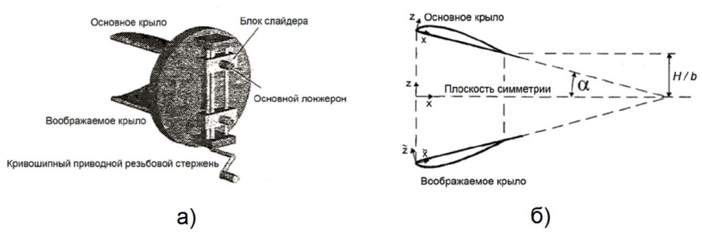 Рисунок 2. Исследование движения профиля крыла NACA 5312 вблизи земли: а) экспериментальная модель, б) расчетная модель. H — высота полета, b — хорда профиля, α — угол атаки. Источник: журнал «Вестник Московского авиационного института».