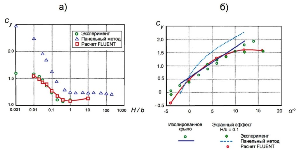 Рисунок 3. Зависимость коэффициента подъемной силы Cy профиля крыла NACA 5312 от а) высоты полета H, отнесенной к хорде профиля b; б) угла атаки α. Источник: журнал «Вестник Московского авиационного института».