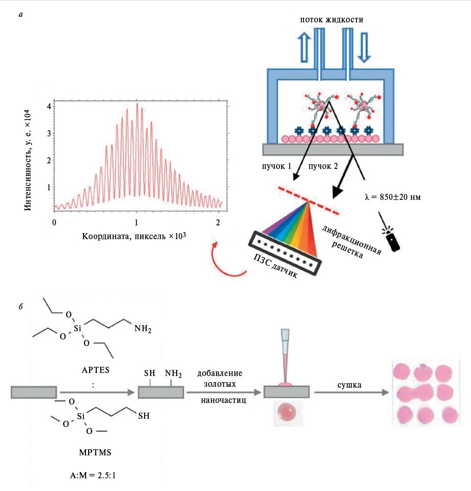 Рисунок 1. Схематическое изображение СФИ биосенсора и биочипа. (а) Принцип работы биосенсора на основе СФИ. (б)Процесс иммобилизации золотых НЧ размером 15 нм на поверхности стекла, модифицированного смесью А:М. Источник: Molecular Biology. Рисунок создан с использованием программного обеспечения BioRender
