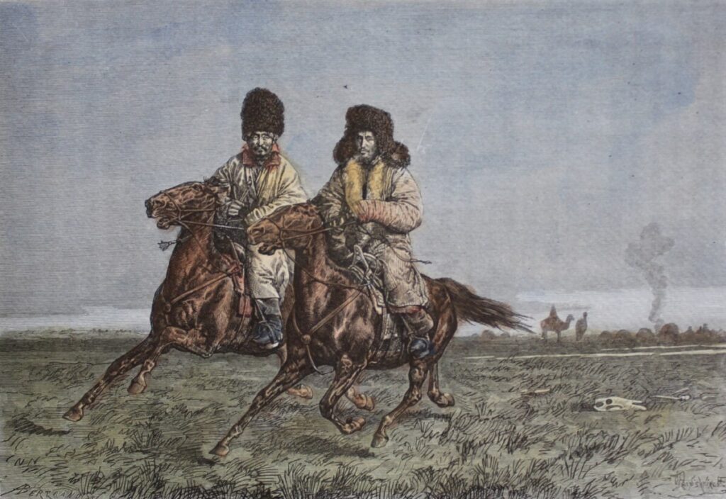 Киргизские всадники. Гравюра, выполненная с натуры для капитального труда Жана-Жака Элизе Реклю «Новая универсальная география. Земля и люди». Nouvelle geographie universelle. La terre et les hommes, т.6. Париж, 1881