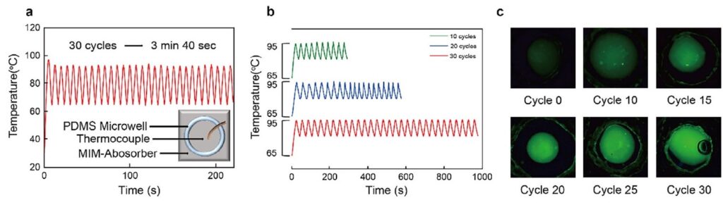 Рисунок 3. Продолжительность реакции в зависимости от количества циклов нагрева и изображения, полученные в ходе флуоресцентной микроскопии. Источник: Laser Photonics Reviews