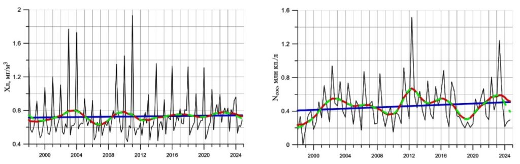 Рисунок 1. Динамика концентрации хлорофилла а Хл (слева) и кокколитофорид Ncoc (справа) в среднем субрегионе Баренцева моря: линейные тренды (синие прямые), скользящее среднее (зеленые штрихи), результаты сингулярного спектрального анализа (красные кривые). Источник: журнал «Современные проблемы дистанционного зондирования Земли из космоса».