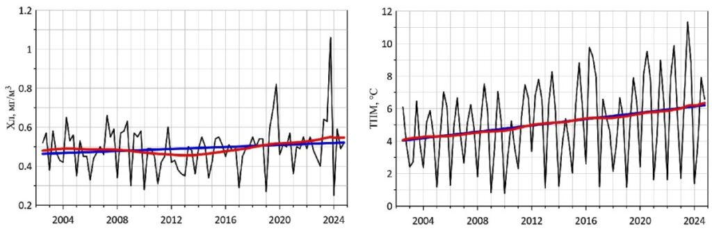Рисунок 2. Динамика концентрации хлорофилла а Хл (слева) и температуры поверхности моря ТПМ (справа) в юго-западном субрегионе Карского моря: линейные тренды (синие прямые), результаты сингулярного спектрального анализа (красные кривые). Источник: журнал «Современные проблемы дистанционного зондирования Земли из космоса».