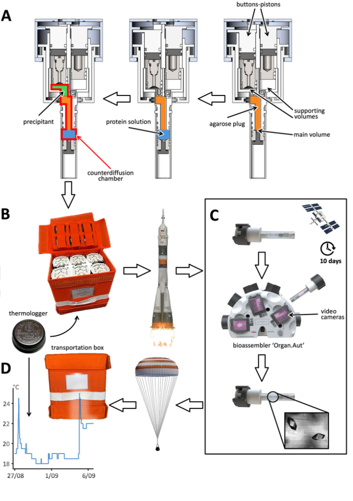 Даже учитывая успехи в области прогнозирования третичной структуры белка, отмеченные Нобелевской премии в прошлом году, получение прямых экспериментальных данных, для которого необходимы высококачественные кристаллы белка, остается чрезвычайно важным. Когда рентгеновские лучи проходят сквозь такие кристаллы, они отражаются от отдельных атомов, создавая уникальные узоры — карты дифракции. Именно благодаря этим картам ученые получают точную информацию о взаимном расположении всех атомов в структуре белка. Кристаллы более высокого качества дают более четкие и точные дифракционные изображения, предоставляя исследователям более подробную информацию. В погоне за совершенством кристаллов исследователи вышли за пределы земного притяжения — в условиях микрогравитации росту кристаллов не мешают конвекционные потоки, а сами кристаллы в ходе роста не оседают на дно кюветы. Эти эксперименты начались еще на станции «Мир», но и на сегодняшний день поиск надежных методов кристаллизации белков в космосе, позволяющих точно контролировать все этапы процесса, продолжается.