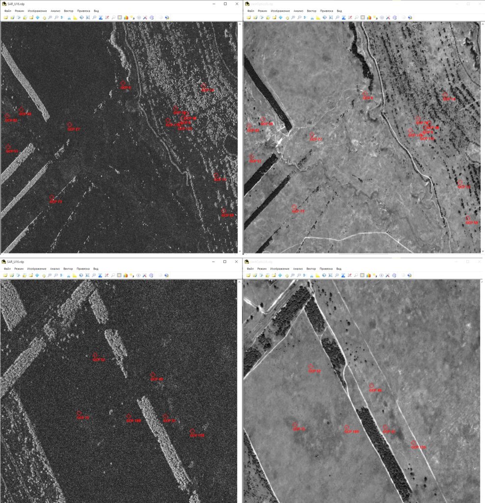 Исходные ошибки геопривязки для большинства снимков превышали 300 метров, в отдельных случаях достигали 4 км. Средняя ошибка привязки исходных радиолокационных изображений составляла примерно 630 м. После применения разработанного автоматического уточнения параметров строгой модели и осуществления геометрической коррекции снимков средняя ошибка снизилась до 26 метров. Минимальное значение ошибки геопривязки составило 6 метров, а максимальное — 67 метров среди всех снимков. Анализ показал, что эти случаи связаны с особенностями фоновой обстановки, низким контрастом объектов интереса, наличием значительных искажений рельефа. Тем не менее даже в этих случаях ошибка была снижена в среднем в 10–20 раз по сравнению с исходным значением.