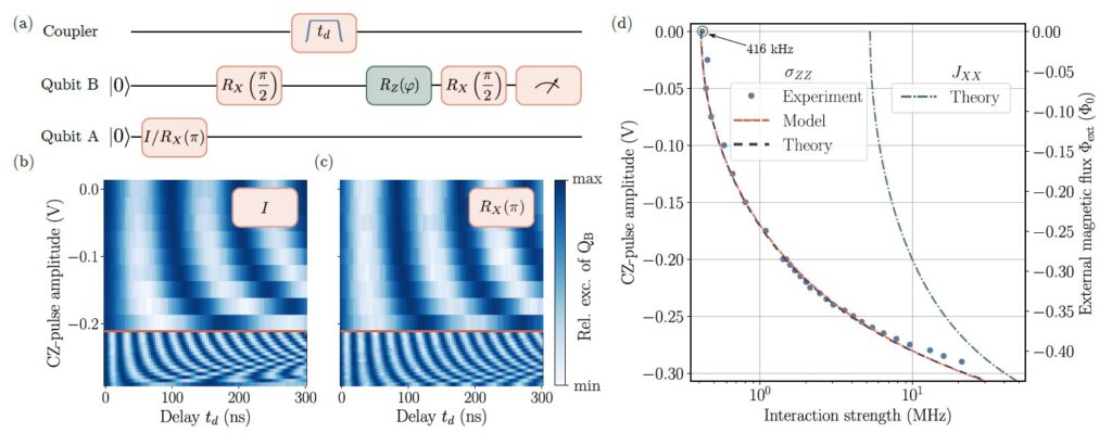 Схема измерения ZZ-взаимодействия. (a) схема импульсной последовательности при измерениях осцилляций Рамзея в эксперименте; (b) и (c): результаты Рамзеевских осцилляций, «сырые» экспериментальные данные; (d) зависимость ZZ-взаимодействия от амплитуды управляющего импульса.