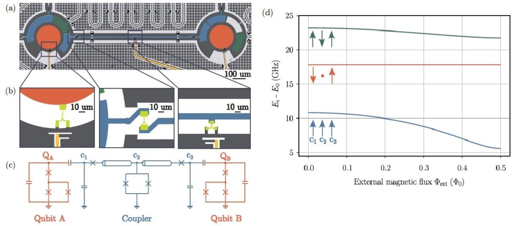 (a) общий вид двухкубитной системы. (b) ключевые наноразмерные элементы; (с) электрическая схема и принцип работы трехмодового элемента связи; (d) изменение энергетических уровней каплера в зависимости от внешнего напряжения