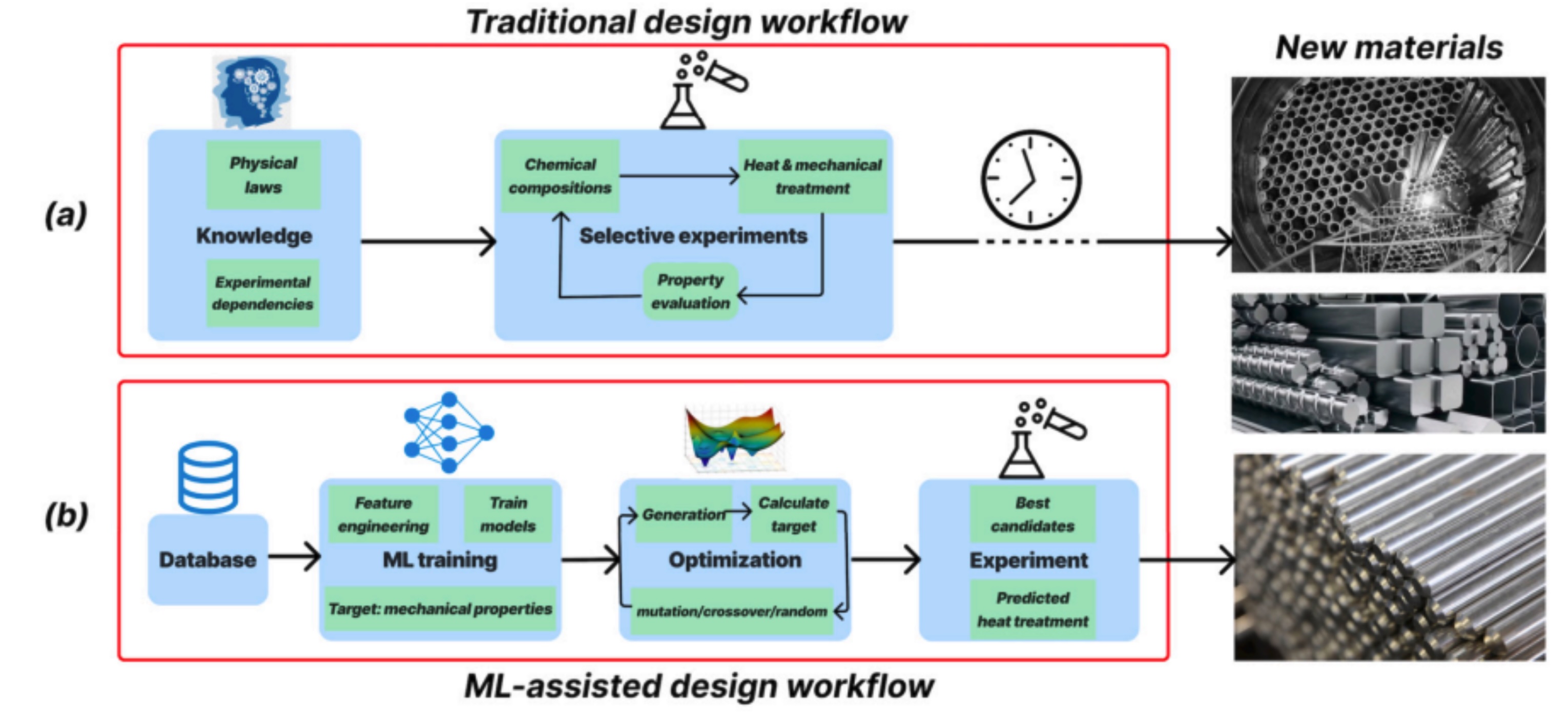 Рисунок 1. Стратегии разработки новых сталей. (a) Традиционный экспериментальный способ поиска новых сталей, требующий значительных временных и трудозатрат. (b) Рабочий процесс с использованием машинного обучения (МО), где сначала собирается база данных, затем разрабатывается алгоритм МО для расчета целевых свойств, затем проводится поиск новых сталей с оптимальными свойствами, и лучшие из них экспериментально проверяются. Источник журнал: Materials & Design.