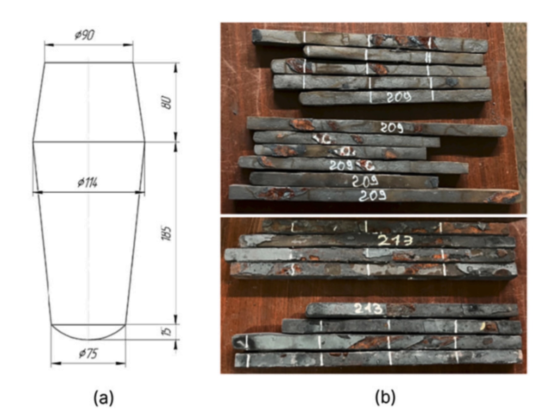 Рисунок 2. (a) Схематическое изображение выплавляемого слитка новой стали, (b) кованые прутья новых сталей. Источник: журнал Materials & Design.