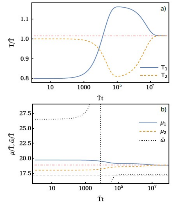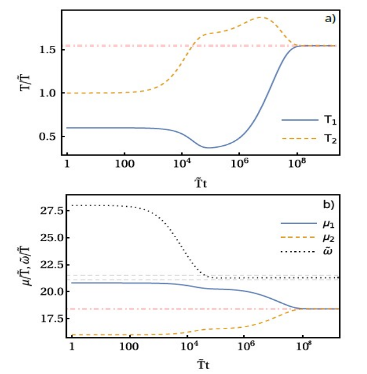 Рисунок 2. Динамика a) температур и b) химических потенциалов двух резервуаров. Изначально более холодный резервуар может не только охладиться, но затем, разогреваясь, на время стать горячее другого. Источник: Physical Review A.