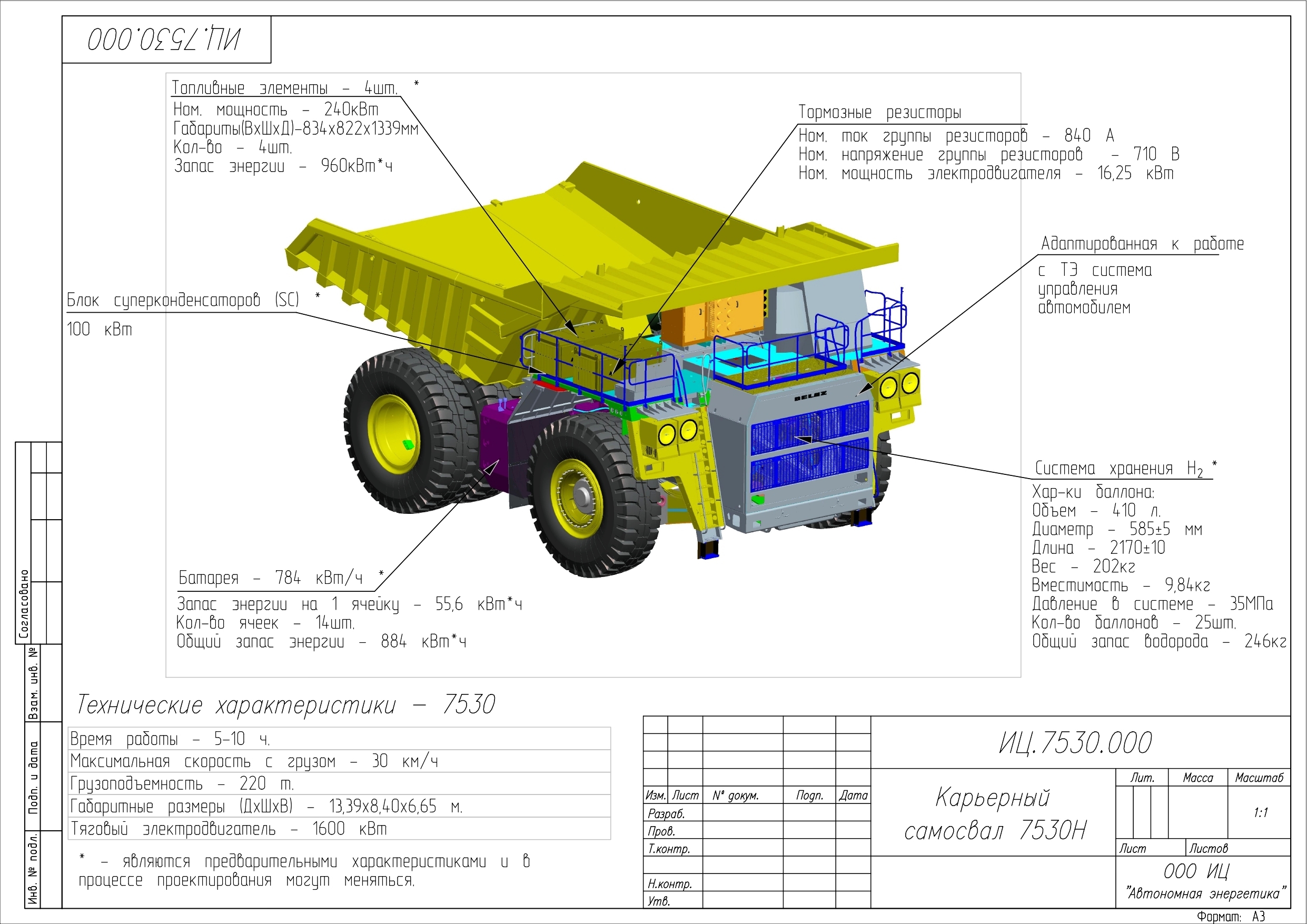 За текущий и следующий год планируется изготовить и протестировать опытный образец. На самосвале БелАЗ-7530 установят генератор энергии на базе топливных элементов общей мощностью около 1 МВт, аккумуляторные батареи и суперконденсатор — электрохимическое устройство, состоящее из двух электродов и электролита между ними, которое быстро заряжается и разряжается. Наличие суперконденсатора в электрической цепи позволит даже при больших токах не терять, а аккумулировать энергию и обеспечивать ей электрооборудование самосвала, работающее в импульсном режиме.