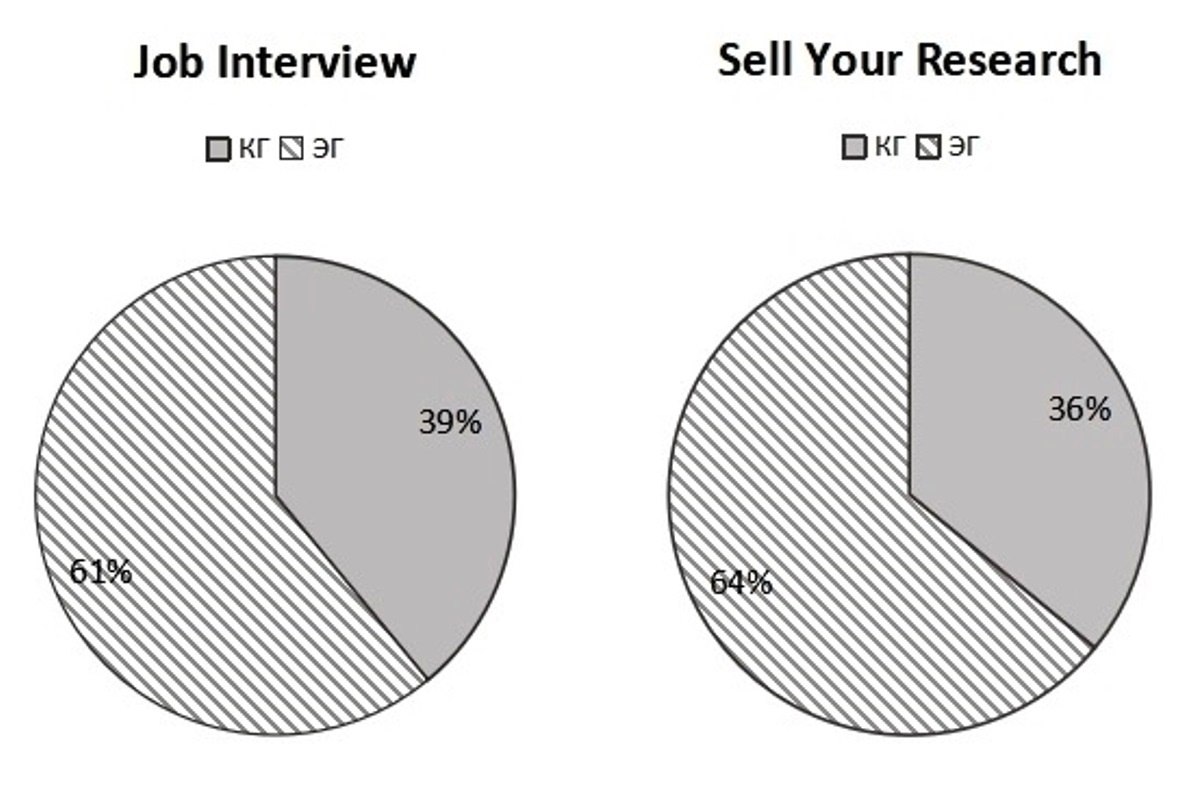 Доля студентов, выполнивших задания ролевых игр: собеседование при трудоустройстве (слева), представление проекта перед грантодателями (справа). КГ — контрольная группа, ЭГ — экспериментальная группа. Источник: журнал «Вестник Тамбовского университета. Серия: Гуманитарные науки»