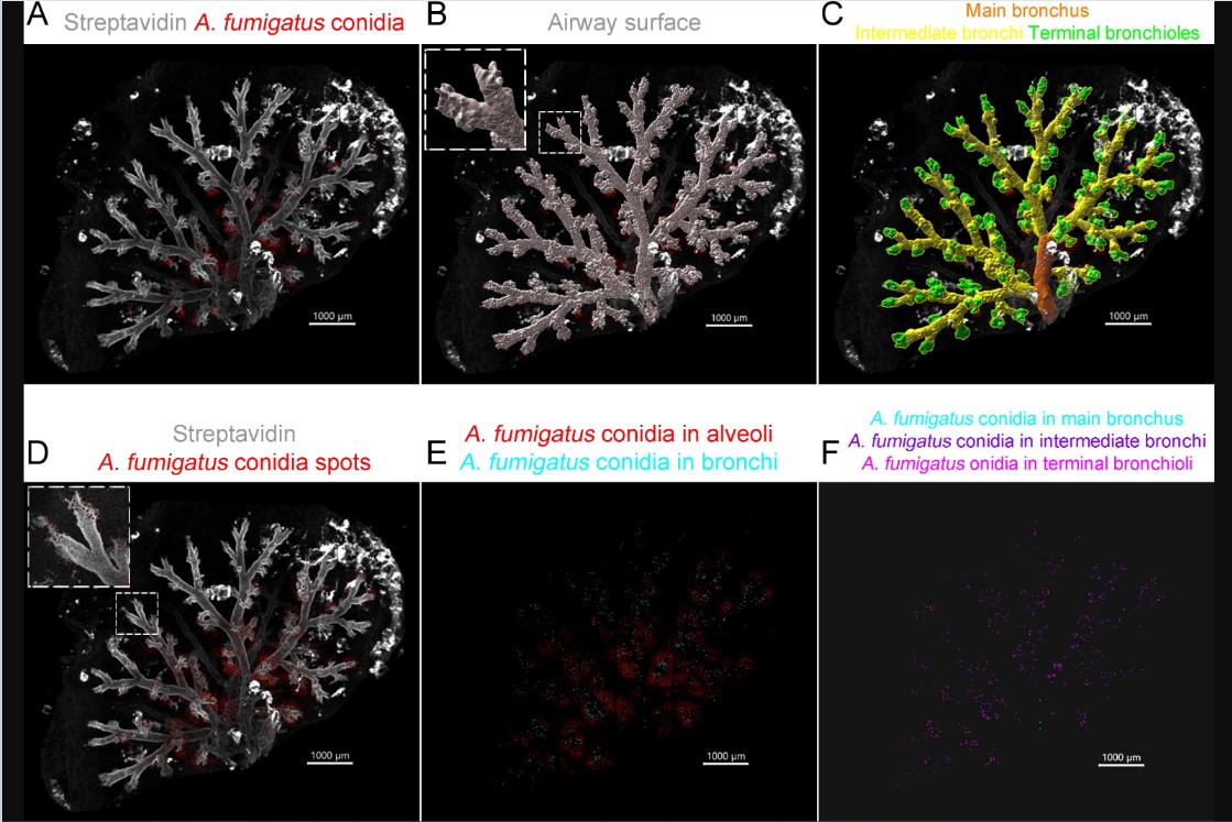 Чтобы получить точные значения плотности конидий в разных частях дыхательной системы, а также количественно описать их взаимодействия с иммунными клетками, биофизики сочетали два метода визуализации. Это получение изображений отдельных долей легкого, которое оценивает относительную плотность и распределение спор гриба, а также анализ с большим разрешением препарата главного бронха. Ученые применили иммуногистохимическое окрашивание и «оптическую очистку» препаратов долей легкого.