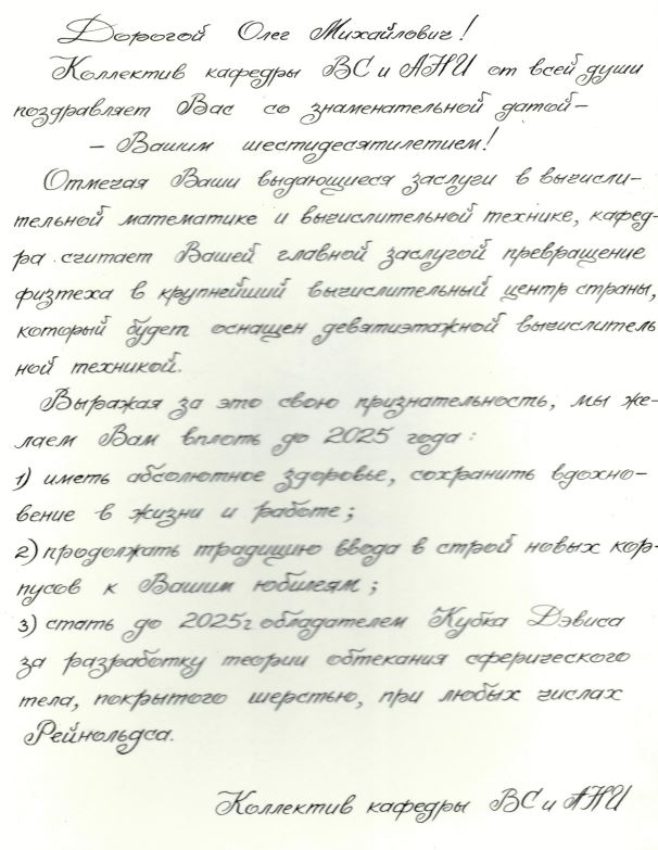 А мы делимся с вами еще одним воспоминанием — поздравлением от кафедры высшей математики МФТИ Олега Михайловича с 60-летием и пожеланиями вплоть до нынешнего, 2025-го, года.