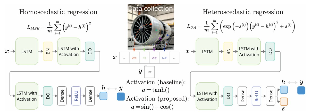 Рисунок 1. Блок-схема регрессионных моделей для остаточного срока службы двигателей. Модель, основанная на гомоскедастических регрессионных потерях, выводит значение гипотезы h, которое должно быть близко к истинному значению y (слева). Новая модель, основанная на гетероскедастических потерях, дополнительно выводит логарифмическую дисперсию s прогноза h, что делает прогноз более интерпретируемым и достоверным, так как модель обучается оценивать собственную неопределенность (слева). Источник: Russian Journal of Nonlinear Dynamics.