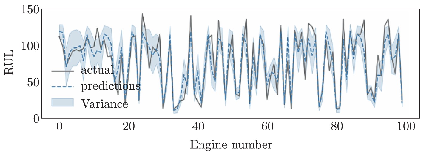 Рисунок 3. Оставшийся срок службы набора испытательных двигателей, рассчитанный с помощью предлагаемой модели, учитывающей неопределенность. Источник: Russian Journal of Nonlinear Dynamics.