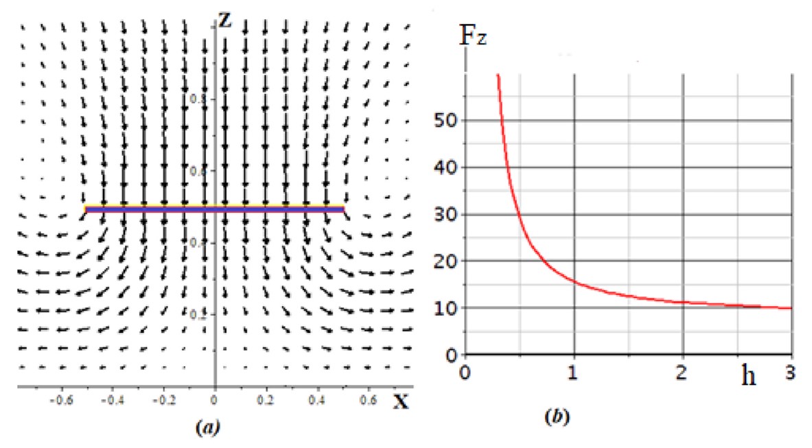 Рисунок 1. Экранный эффект в действии: сопротивление среды при приближении к поверхности. Слева (a) показано, как опускающаяся пластина вытесняет разреженный газ, создавая потоки, направленные в стороны и вверх. Справа (b) график демонстрирует, что при уменьшении расстояния до поверхности (ось h) сила сопротивления (ось Fz) резко возрастает, стремясь остановить движение пластины. Источник: журнал Acta Astronautica