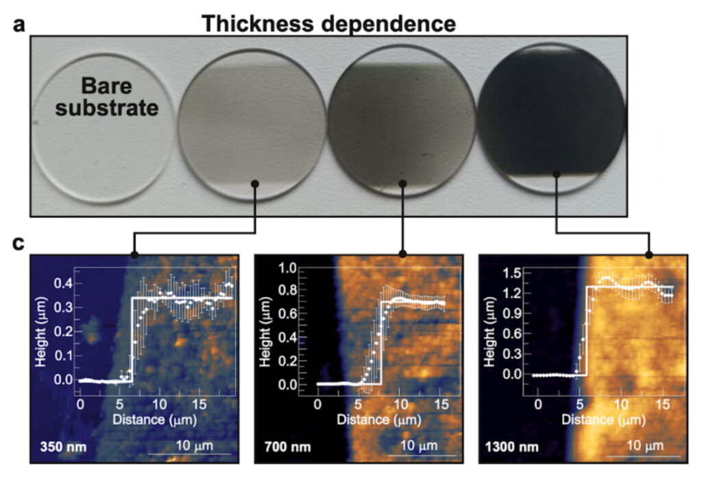 (а) Фотографические изображения Ti3C2Tx различной толщины (350, 700, 1300 нм) вместе с чистой подложкой (справа налево); (с) изображения атомно-силовой микроскопии вблизи края пленки сопровождаются соответствующими многократно усредненными сечениями.