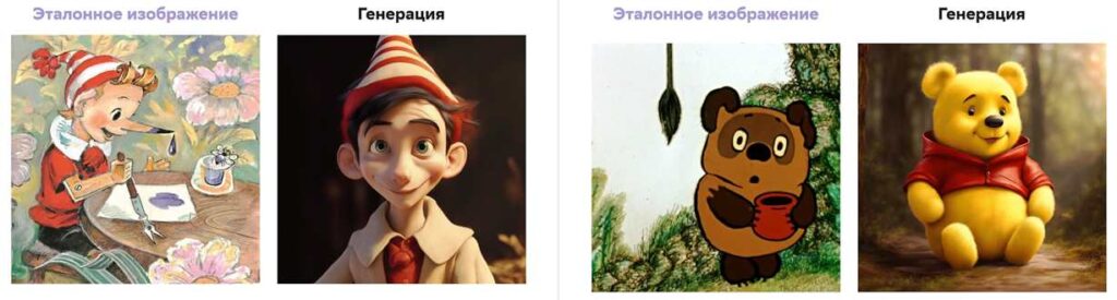 Генерация по промптам: «Буратино, кадр из мультфильма» (слева) и «Винни-Пух, кадр из мультфильма»