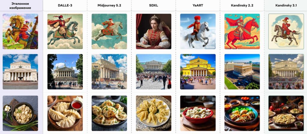 С целью проверки информационного наполнения модели Kandinsky 3.1 до и после обучения исследователи по описанию сгенерировали внешний вид нескольких объектов: героев русских сказок и мультфильмов, исторических зданий, блюд национальной кухни. Кроме того, разработчики поставили сравнительный эксперимент и задействовали в нем еще пять моделей.