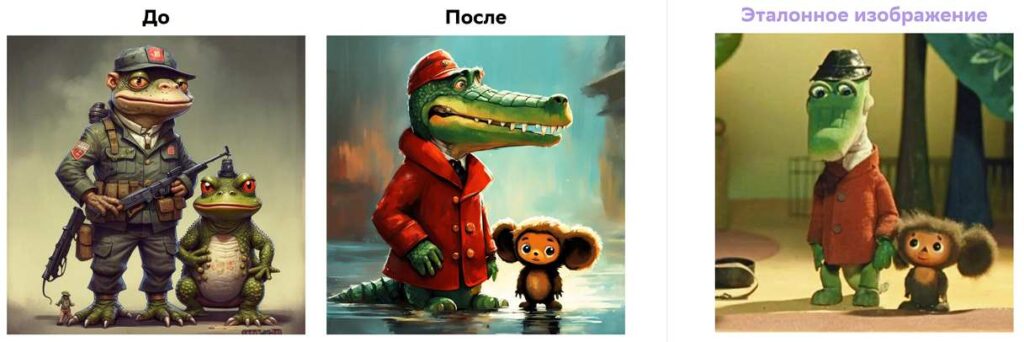 Генерация изображения по тексту «Крокодил Гена и Чебурашка, советский мультфильм» моделью Kandinsky 3.1 до и после дообучения.