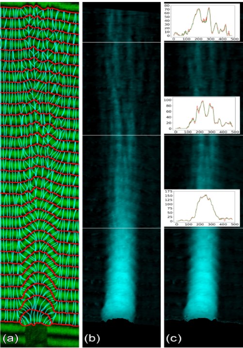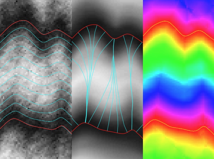 Рисунок 4. В крупном масштабе кратко три стадии: 1) Выделение интерференционных полос и построение изофаз на исходном кадре, 2) построение линий, перпендикулярных к изофазам, для наилучшего расчета фазы, 3) итоговая фаза световой волны в цветовой шкале. Источник: IEEE Access.