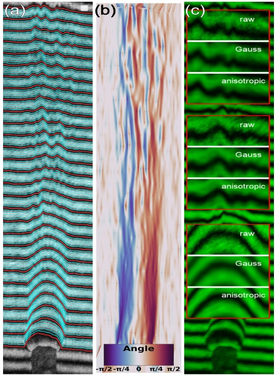 Рисунок 2. Эффективность анизотропного сглаживания WISP. Основное изображение (с) показывает результат обработки интерферограммы методом WISP после первого цикла. Увеличенные фрагменты (вставки в красных рамках) наглядно демонстрируют разницу: (raw) — исходный зашумленный участок; (Gauss) — результат применения стандартного гауссова фильтра, который не только убирает шум, но и сильно размывает полезный сигнал, «замыливая» структуру полос; (anisotropic) — результат работы метода WISP, который выборочно удаляет шум вдоль полос, полностью сохраняя их резкость и кривизну. Источник: IEEE Access.